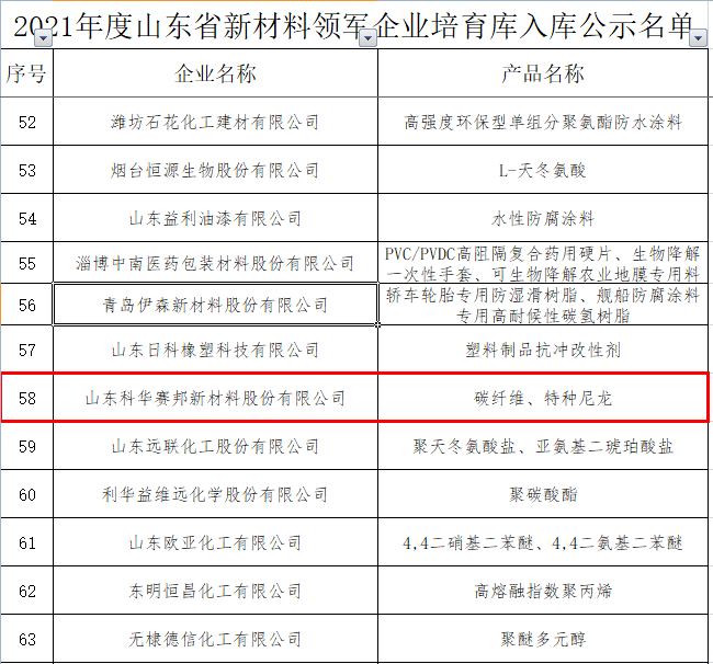 2022年1月19日,山東省工業(yè)和信息化廳公示了“2021年度山東省新材料領(lǐng)軍企業(yè)培育庫(kù)入庫(kù)企業(yè)名單和50強(qiáng)企業(yè)名單”科華賽邦作為一家集配方研究——產(chǎn)品試制——性能檢測(cè)——試用運(yùn)行——產(chǎn)業(yè)應(yīng)用于一體,為客戶提供整體解決方案的創(chuàng)新型技術(shù)企業(yè),榮登榜單之中,這標(biāo)志著我公司在研發(fā)和創(chuàng)新方面得到肯定與認(rèn)可。